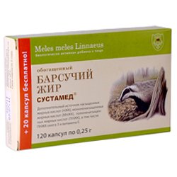 , Fat Badger is used in folk medicine, as well as Tibetan and Buryat medicine as a tonic and a treatment for lung diseases, respiratory tract, skin diseases, wounds and burns, which is associated with a high content of polyunsaturated acids and peace of vitamin A. Vitamin E has antioxidant properties, has a positive effect on the cardiovascular system of the body, the function of sexual organs, increase efficiency and resistance to various infections.Recommended dosage: adults 6 capsules three times daily with meals, which provides 10% of the daily requirement of polyunsaturated fatty acids, including omega-3 18% and 20% of vitamin E. Course admission for 1-2 months, can be repeated 2-3 times a year. consists of a badger fat 80%, and wheat germ oil 20% - natural sources of polyunsaturated fatty acids omega 6 and omega 3, vitamin E and A. The composition of fat include: Oleic acid - 32% Linoleic acid C 18:2 - 20% Linoleic acid C 18:3 - 4.5% Arachidonic acid C 20:4 - 1.68% Cholesterol levels - 59.4 mg/100 g Wheat germ oil contributes to the dietary supplement vitamin E.